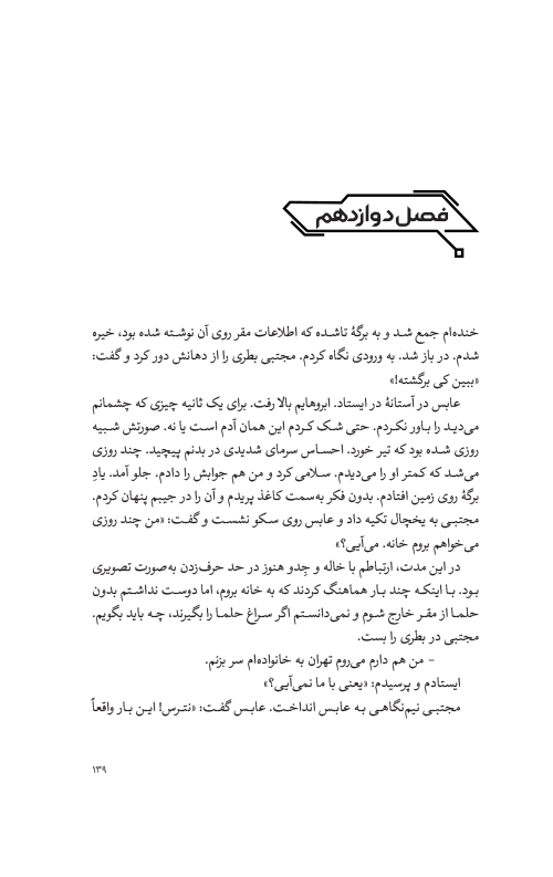 دستم را مدام تکان میدادم تا از ساحل دورش کنم، اما او هم برایم دست تکان میداد. صدای دویدن یک نفر را از پشتسرم شنیدم. یک آن، در سمت راستم عابس را دیدم که چیزی را به زمین کوبید و پلی شبیه نردبان روی رودخانه ساخته شد. یک دفعه پای بچه لیز خورد و بدون تعادل در آب افتاد.