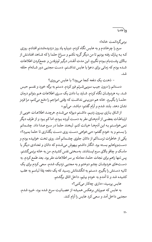 نخلها بهسمت خانههای پشتشان خم شده بودند. چراغها منفجر میشدند و موجِ بزرگی با ماهیهای پرنده در ساحلِ خاکیِ روبهرو سقوط میکرد. صدای دویدن عابس از سمت چپ شنیده میشد. سرم را چرخاندم. موج بزرگی در حال شکستنِ پل ساختگی بود. عابس در یک حرکت سریع، یک پایش را روی قسمتی از پل فشار داد، به هوا پرید و در موج بلند روبهرو فرو رفت. فریاد زد: «تمامش کن.»