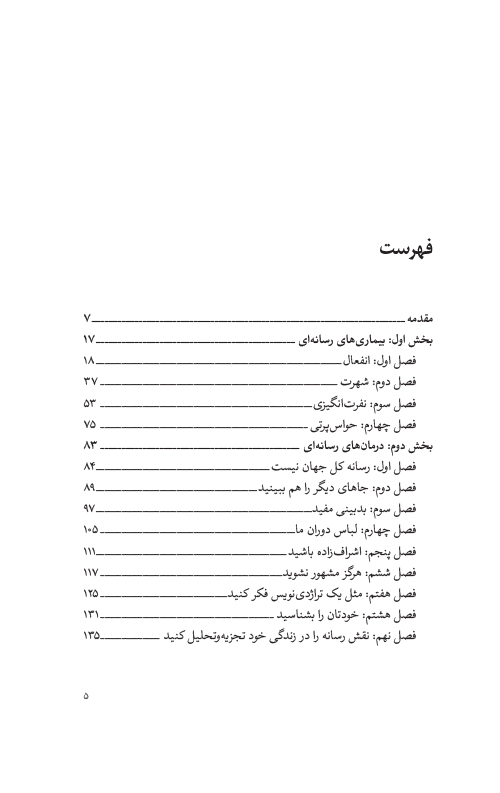 این کتاب راهنمایی برای درک و یادگیری مقابله با آسیب هایی است که رسانه ها به اذهان ما وارد می کنند. این کتاب ویژگی های عجیب و غریب رسانه ها را به ما معرفی می کند؛ مثلا ویژگی هایی از قبیل تمرکز افراط گونه رسانه ها روی شایعه ها، اصرار آن ها روی چیز های جدید، قدرت آن ها برای تشدید حسادت ها و خود بیزاری ها، دفاع بسیار متفکرانه آن ها از خودشان، گستره توجه آن ها که اکنون تنگ تر از هر زمان دیگری است، وسواس فکری رسانه ها درباره شهرت و نگرش حق به جانب آن ها که در همه داستان های خبری شان به چشم می خورد.