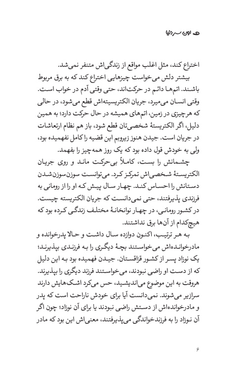 برای ساعت‌ها به هیچ خیره شد، همان طور که دکتر ویلدر عادت داشت بگوید: «خاموش شد». در یک لحظه توانست صدای پنی را بشنود که انگار داشت از فاصله‌ای دور می‌گفت: «اون خاموش شده». جیدن به بیرون خیره شده بود. گاهی اوقات، چند روز خاموش می‌شد. نمی‌شد پیش‌بینی کرد که این خاموشی ممکن است چقدر طول بکشد.