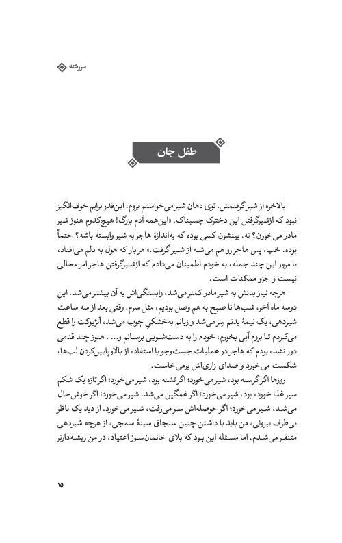 بالاخره از شیر گرفتمش. توی دهان شیر می‌خواستم بروم، این‌قدر برایم خوف‌انگیز نبود که ازشیرگرفتن این دخترک چسبناک. «این‌همه آدم بزرگ! هیچ‌کدوم هنوز شیر مادر می‌خورن؟ نه. بینشون کسی بوده که به‌اندازۀ هاجر به شیر وابسته باشه؟ حتماً بوده. خب، پس هاجر رو هم می‌شه از شیر گرفت.» هر بار که هول به دلم می‌افتاد، با مرور این چند جمله، به خودم اطمینان می‌دادم که ازشیرگرفتن هاجر امر محالی نیست و جزو ممکنات است.