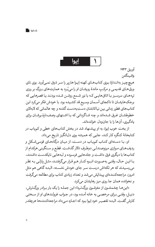 از آن موقع، هروقت یک دسته کتابِ بیصاحب روی میز مطالعۀ کتابخانه میدید، این جمله در ذهنش مرور میشد. مراجعهکنندۀ بیچاره هم تقصیری نداشت. حتی فیلسوفان بزرگ گذشته هم نمیتوانستند در یک بعدازظهر، آنهمه اطلاعات را توی مغزشان جا بدهند. اما این جملۀ دنیل عجیب به دل اِیوا نشسته بود، چون با تکرارش، یاد نگاه خندان او میافتاد.